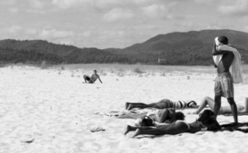Dans ce rien à voir, donc, restent les corps des autres. Se scruter aussi pour mieux s’approcher, mieux se séduire. Toucher avec les yeux. Les regards se déposent de contours en contours, suivant différents rapports de force et leurs logiques de genre, de race et de classe. En dépit de ces micro-violences, et dans tous leurs mouvements, une destination commune : la plage. Le bout de leur monde. Depuis la périphérie, le trajet et ses détours laissent vivre la chasse aux moustiques et la ronde des caddies jusqu’au temps suspendu au-dessus des serviettes recueillies par le sable. Grains contre peaux, pour un moment, se plaire, se parler, s’éclabousser, pendant que les rayons réchauffent le sang ou les cœurs, le parachute en demi-lune emporté par la brise. Le temps vaque, on respire enfin.