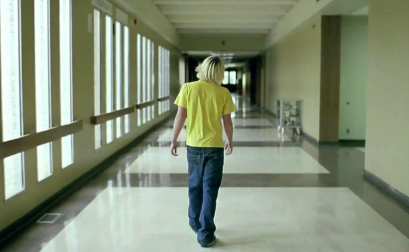 L’automobile ne parvient pas à garder le cap, foule les feuilles mortes, puis le premier carton du film apparaît : « John ». De quoi/qui est-il le nom ? Le visage de l’enivrement, du trépas ? Une chevelure blond platine surgit dans le plan. Il sort de la voiture, côté passager, dépassé. Au cœur de son t-shirt jaune, un taureau, tout de noir. Et ce visage angélique, tout de blancheur. Cette scène d’ouverture est le paradigme des effets recherchés par le metteur en scène. Il s’agira de créer par la langueur des travellings-séquences, par la répétition d’une même action depuis l’oscillation des points de vue (chaque carton introduit un ou des nouveaux personnages) une sensation d’ivresse. La boucle est « un des traits esthétiques dominants de la tétralogie », et à ce titre, il construit l’espace scolaire comme un lieu clos et circulaire, proche de l’architecture carcérale. Il en devient un labyrinthe (de Cnossos, si l’on songe au Minotaure), avec la caméra comme système de surveillance. Les mouvements des personnages sont scrutés, les bribes des banalités échangées, capturées. Alors, contempler Elephant, c’est accepter de se perdre dans une boucle spatio-temporelle, dans un établissement labyrinthique et avant tout d’éprouver ce « désir de contemplation organique ». Enfin, et surtout, c’est observer la déliquescence d’un milieu, doucement mais sûrement, comme une bombe à retardement, à travers la chronique d’une mort annoncée.